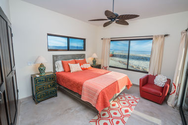The Dorado Bedroom also has sliding glass doors that lead out to the patio and onto the beach. The ocean is visible from the sliding glass doors, and the window above the bed provides views of both the mountain range and ocean.